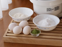 材料(31×27センチ1台分) 卵 Lサイズ4個 砂糖 150グラム 薄力粉(スーパーバイオレット) 100グラム 抹茶 13グラム 牛乳 30CC