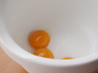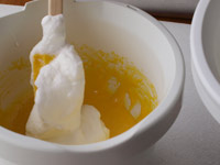 1.今回はボッシュのミキサーで卵黄用と卵白用のボウル2個使って泡立てます。シフォンケーキを作るときだけはボウルとウイスクが2個ずつあると本当に便利です。まず卵黄をボウルに入れ、砂糖20グラムを加えます。加えると同時にすぐにミキシングを始めます。卵黄は水分が少なく砂糖を加えてそのまま放っておくとブツブツしてきますので砂糖を投入したらすぐにミキシングを始めましょう。途中でマシーンを止め側面の混ざりきらない卵黄をよく合わせます。そして再度ミキシングです。徐々に白っぽくもったりしてきます。この間スピードはずっと高速の「4」のままで良いです。