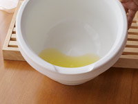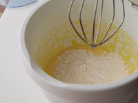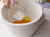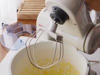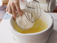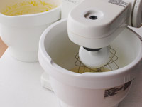 MEMO 画面でも登場しておりますがシフォンケーキは卵黄と卵白のそれぞれの材料を手早く泡立て、そして両方を合わせ、型に流し込んで一気に焼き上げるのがポイントです。ひとりで作業するのですから、あらかじめ準備できるものは全て用意しておきましょう。ボウルとウイスクが2個ずつあってよかったと実感できるケーキですが、ボッシュのボウル1個で行う場合は、卵黄の生地をボッシュで作り、卵白は別の大きめのボウルに入れて、ハンドミキサーを使って泡立てると良いでしょう。またボッシュのマシーンをご使用にならない場合はボウル2個は必要です。また泡だて器も2本あると便利です。ハンドミキサーをご使用になる場合は卵黄の生地が出来上がったら、ハンドミキサーの羽をきれいに洗い余分な水分をしっかりとふき取ってから次の卵白の泡立てに取り掛かりましょう。卵白の泡立てでしっかりとしたメレンゲに仕上げるには、ボウルと泡だて器に油分や水分が付いていないことが大切です。