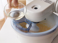 4.ここでウイスクからビーターに羽を変えます。2回ふるったスーパーバイオレットを加え、ビーターの羽でスピードは「2」です。30秒ほど粉合わせします。粉気がなくなったらOKです。