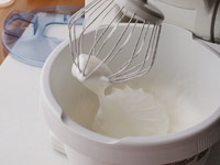 5.いよいよ卵白を泡立てます。もう一つのボウルに卵白を入れ泡立てていきます。まず卵白だけをミキシングしてかなりフワっとするまで泡立てます。(高速の「4」でおよそ1分30秒〜2分くらい)そして残っている砂糖50グラムを加えさらにミキシングします。高速の「4」で1分くらいのミキシングでOKです。マシーンを止めピンと角が立つくらいになったでしょうか。もしまだのようでしたら、様子を見ながらしっかりと泡立ててください。この卵白の泡立ては膨らみに影響しますので重要ですよ。マシーンを使うのはここまでです。