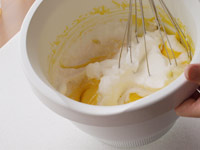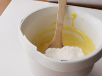6.「4」のボウルにメレンゲの3分の1を加え、泡だて器でメレンゲを馴染ませます。次に残ったメレンゲの半分を加え、ここからは穴あき木べら(なければスパチュラで)に持ち替え、底の方からしっかりと、大きく木べら合わせましょう。この段階では粉気はないはずですから、メレンゲの泡をつぶさないように、全体に均一に行き渡せる感じで合わせます。