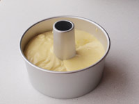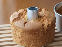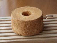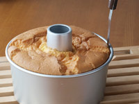 注:シフォンケーキを焼くときは敷き紙は使いません。ケーキ生地が型に張り付くことが大事なのです。焼き上がったあと型を逆さまにして冷まします。こうすることで生地がしぼんでしまうのを防ぎます。ぺったりと張り付いた生地をナイフあるいは竹串を縦に大きく使って型からはがします。ですからご使用になる型は底取れタイプのシフォン型をお奨めいたします。