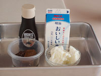 牛乳140CC(砂糖ティースプーン山盛り2杯) 板チョコ 2×4センチを2枚 バニラアイス 60グラム ハーシーのチョコレートシロップ 大匙山盛り1杯 |