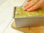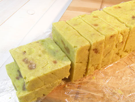 ちなみに私はパンの型のロング缶を使ってみました。空気を入れないように詰めるために、途中でトントンと型を落として空気を抜きながら生地を詰めましょう。冷蔵庫で完全に冷してからラップごと取出し、端からカットします。お好みのサイズにカットしていろんな形のきんつばを作っちゃいましょう。