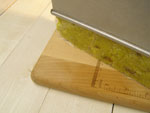 6.完全に冷めてカチっとしたら、型からラップごと取り出します。まな板の上で厚さ1.5〜2センチほどにカットしましょう。このままいただいても良いですが、頑張って仕上げをいたします。