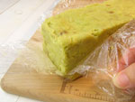 ●簡単に言うとお芋のきんつば風です。形をスクエアに整えるためには、何かお手持ちの四角い型にラップを敷き、そこへスイートポテト生地をピチっと詰めて整えます。