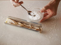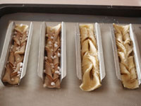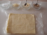 ◇材料◇デニッシュバー型240ミリ 4本分 冷凍パイ生地200×200ミリ 1枚 粉チーズ 適量 シナモンシュガー 適量 あられ糖 適量 ※シナモンシュガー ・グラニュー糖 50グラム ・シナモン 小匙2 ・サラダオイル 数滴 |