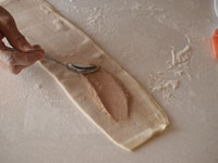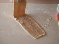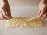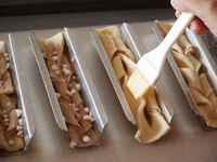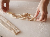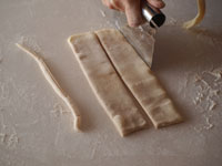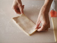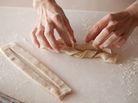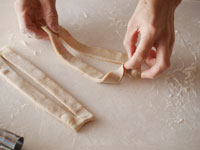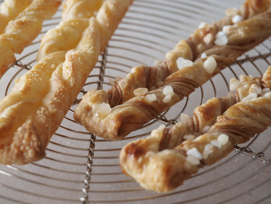 シナモンパイ&チーズパイ ●「デニッシュ・バー型」ならまっすぐ焼ける!ということで冷凍パイ生地を使ってねじりパイを作ってみました。予想通り、まっすぐ一直線にのびた美しいパイに仕上がりました。粉チーズ入りとシナモンシュガー入りの二種類のスティックパイです。冷凍パイ生地は扱いが楽ちん♪なので思いついた時にできるお菓子です。シナモンシュガーはグラニュー糖とシナモン、サラダオイルで簡単に作れますので分量を記載しました。パン生地にもよく登場するシナモンシュガーですのでぜひご自宅で準備してみてください。