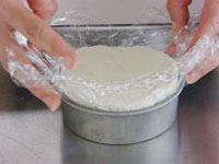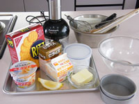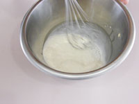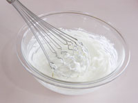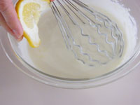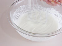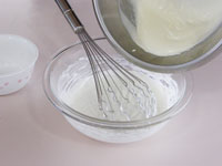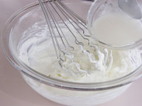 8.別のボウルに生クリームと残りの砂糖を入れ泡立てます。このときの泡立て具合ですが、7分立てです。完全に泡立ててはダメです。とろーりくらいがベストです。この7分立ての生クリームを「7」のボウルに入れて合わせます。そして最後にレモン汁を加え、全体が均一になったらチーズクリームの出来上がりです。