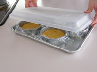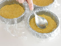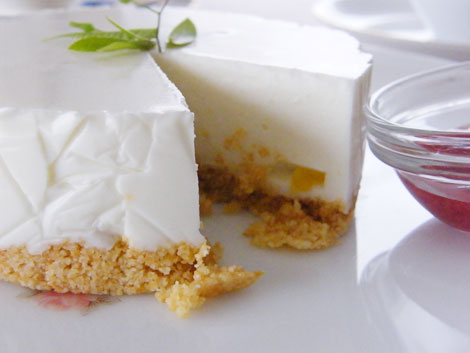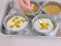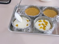 9.冷蔵庫で冷やした型を取り出し敷き詰めたリッツの上に、チーズクリームを流し込みましょう。マンゴのような柔らかいフルーツがあれば途中で加えるとGOODです。口切りいっぱい注ぎ込みあとは冷蔵庫でしっかり冷やします。
