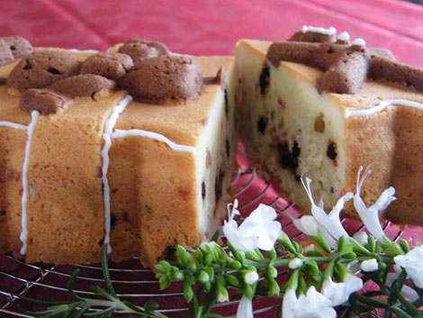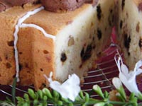 8.中央をへこまして180度に予熱したオーブンに入れ、40〜45分焼きます。表面の焼き色が濃くなってしまってもまだ中まで火が通っていない場合は、アルミ箔で表面を覆い焼いてください。ケーキテスターで中まで火が通っているか確かめ、焼けていたらオーブンから出し、型ごと10センチほどの高さからトンと落としショックを与えます。そして網の上に取り出します。あら熱を取り、粉砂糖のアイシングで飾るとさらに可愛らしく仕上がります。 |