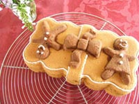 ●ジンジャーくんのモチーフがくっきり焼ける可愛いケーキ型。さっそく大きなフルーツケーキを焼いてみました。プレゼントやクリスマス用のケーキとしても大いに活躍してくれそうな素敵なケーキ型!ケーキ生地の一部を別に取り、ココアを混ぜてジンジャーくんとりぼんのモチーフ部分に、はみ出さないよう搾ります。その上にドライフルーツ入りの生地を注ぎ入れます。くっきり可愛いジンジャーくんのケーキに焼き上がるのを待つのが楽しみなケーキです。