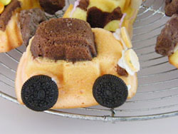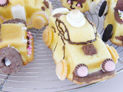 8、家族の歓声が聞こえてくる出来映えにしあがりました。デコレーションをしないと普通のバターケーキです。是非是非、必ず、お子様の喜ぶお顔を思い浮かべながら、ソースせんべいを丸く抜いてみたりしてくださいネ。最初は、・・・・・エーと思っていても仕上がっていくうちにかなりはまります。