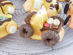 ココア生地を搾り出し袋に入れて車輪、屋根にココア生地を搾り出しておきます