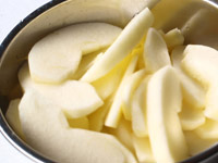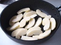 2.フライパンにリンゴを並べ、上から砂糖をふります。