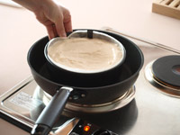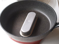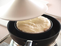 5.今回はフライパンで蒸し焼きにします。タジン蓋をして予熱したフライパンの中央に小さめのフィナンシェ型、あるいはマドレーヌ型を置きます。そしてその上に「4」をのせます。