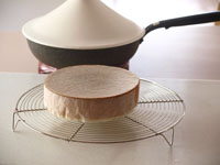 ●フライパンとタジン蓋を使ってケーキを焼いてみました。えー!と、お思いかも知れませんが意外なことに出来ちゃうんです。しかも乾燥させないから、しっとりふわふわに仕上がります。タジン蓋がここまでやってくれるとは驚きです。ポイントはフライパンにタジン蓋をのせ、空焼きの状態で予熱させておくことです。そしてもう一点!準備のできた生地をいれた直径18センチのケーキ型を直にフライパンに置くのではなく、小さめのフィナンシェ型、あるいはマドレーヌ型を置いてその上にのせてください。こうすると熱の周りは柔らかくなります。直に置いてしまうと下火が強すぎてきれいに焼き上がらないので必ず浮かせて型を置きましょう。またデコ型は底が取れないタイプをお使いください。