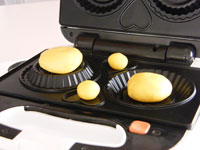 5.いよいよワッフルメイカーで焼き上げます。予熱したワッフルメイカーに生地を並べ、蓋をして約5分30秒〜6分焼きましょう。必ず予熱したところにタルト生地をセットしてください。