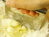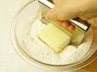 1.キッシュやタルトのような生地はフードプロセッサ―がなかなか便利ですが、今回はマシーンを使用せずにスケッパーを使いボウルの中でバターをきざんで作っていきます。この作業はそれほどたいへんな作業ではありませんのでザクザクきざんでやってしまいましょう。深めのボウルに薄力粉・砂糖を入れます。そこへ冷蔵庫から出したバターをのせます。始めはバターが大きいので頑丈なスケッパーでやると良いです。カチンカチンのバターをいきなりパイブレンダーでカットするとパイブレンダーの刃が歪んでしまいますので、まずはスケッパーでザクザク小さくし、ある程度小さくなったら、パイブレンダーに持ち替えてやると作業がスピードアップします。(今回は粉類をふるわなくてOKです)