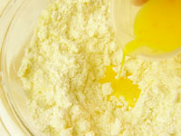 2.小豆の粒ほど大きさになったら終了です。卵黄と水を溶いた液を少しずつ注ぎながら、粉全体にしみ込ませる感じでスパチュラで底の方から全体を練らないように合わせます。ここでは生地全体に水分が行き渡るようにするのが大事です。パラパラな感じになれば良いです。