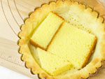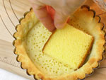 4.焼き上がったタルト生地が完全に冷めたら、市販のカステラを上手にカットしながら敷き詰めます。