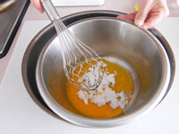 1.卵は卵白と卵黄に分けてミキシングします。ボウルを2個準備し、卵白と卵黄を割りほぐします。卵黄のボウルを湯せんにかけながら卵黄用の砂糖を加え、もったりするまで泡立てます。濃い黄色が薄い黄色になり、もったりしてきたら攪拌はOKです。