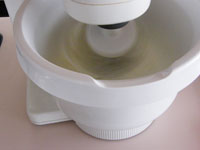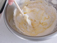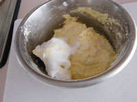 5.最後に残ったメレンゲを全部加え合わせます。まだ少し粉気が残っているくらいのときに、水20CCをスパチュラで受けながら回し入れ、全体に馴染ませます。粘らないように均一に合わせたら生地の完成です。