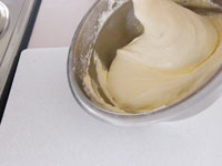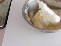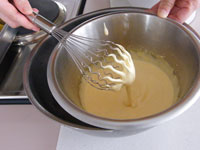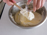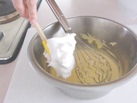 3.「1」の卵黄に「2」のメレンゲを3分の1加え、泡だて器で混ぜます。