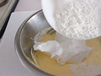 4.さらに、メレンゲの残りの半分とそこへふるった薄力粉(スーパーバイオレット)を全部加えスパチュラに持ち替え粉合わせをします。