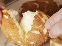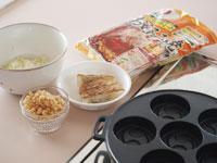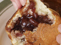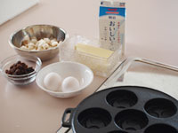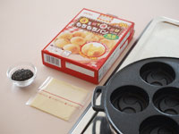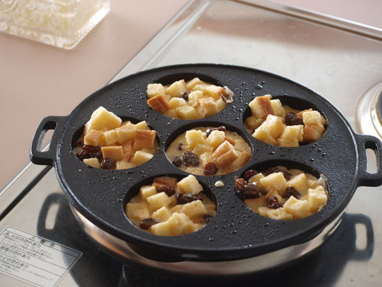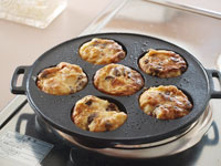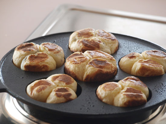 ●巴焼き専用のフライパンでいろいろ作ってみました。生地はホットケーキミックス、お好み焼きの素、市販のもちもちパンミックス、など手軽な材料をあれこれ揃えて鉄鍋の醍醐味を味わってみました。分厚い鉄板でできた「巴焼き器」は、昔ながらの鉄鍋です。ノンスティック加工に慣れている方には、ちょっと扱いにくいところもありますが、出来上がりの焼き色は抜群でしかもカリカリに仕上がります。大事な点は「巴焼き器」を熱するところにあります。十分に熱していないと材料がこびりついてしまうので、その点さえ熟知してしまえば、鉄鍋ならでは美味しい今川焼のアレンジがいただけます。手順はこんな感じです。直火に「巴焼き器」をのせ強火で熱します。1分もたたないうちにうっすらと煙が出てきます。そこで弱火にします。キッチンペーパーに油を十分にしみこませ、表面に油を塗ります。このとき、一番上の平らな面にも塗っておくと良いです。次に塗れ布巾の上に数秒置き(ジュッといいます)一瞬ですが、鉄鍋を冷まします。再び火にかけます。ここからは弱火にし、もう一度油を回しいれます。これで準備完了です。それでは、アレンジ「巴焼き」のいろいろをご紹介します。
