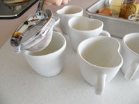 ※ ハートのカップに溶かしバターを塗り強力粉を薄っすらふっておきます。(余分な粉は落とします)あるいは、生地が器に張り付いてしまいますが、バターを塗らずにそのまま流し込んでもOKです。その場合はスプーンですくってどうぞ。