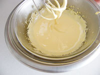2.卵黄をボウルに入れ40度の湯せんで少し温めます。温めることで砂糖が溶けやすくなるからです。ハンドミキサーで卵黄をミキシングします。そこへ砂糖(27グラム)を入れ、黄身の色が白っぽくもったりするまでしっかり泡立てます。卵黄に砂糖を加えるときに注意することは、砂糖を加えたらすぐに泡立てることです。卵黄は水分を吸ってしまう性質があり、砂糖を入れてそのまま放っておくとブツブツになってしまいます。砂糖を加えたらすぐに泡立てましょう。