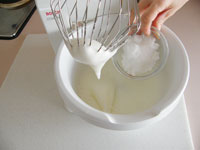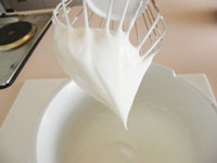 4.次にボッシュのマシーンでメレンゲを作ります。ボウルに卵白を入れ1分ほど泡立てたところで砂糖を加え、さらにしっかりと泡立てます。ピンと角がたつまでしっかりミキシングしましょう。卵白の泡立てで一番大事なことは、まずボールとホイッパーに油分や水気がないこと、また初めはまず卵白だけで泡立てます。そのあと砂糖を加えます。決してはじめから砂糖を入れないでください。きれいなつやのあるメレンゲが出来ましたか?(ガトー・ショコラはこの卵白のあわ立てが、出来具合いにかかわってきます。)