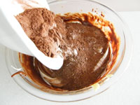 そこへ、よくふるってある(2回はふるっておきます)小麦粉とココアをいれ、混ぜていきます。この時にメレゲの白っぽい部分も全体に馴染んできます。メレンゲの泡をつぶさないように、でも粉気が完全になくなるまで、上手に粉合わせしましょう。
