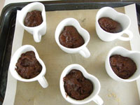 7.ハートのカップに生地を七〜八分目まで入れます。170度のオーブンで17〜18分で焼き上がります。熱々のところをスプーンですくってどうぞ!またしっかり冷やしバニラアイスを添えていただいても、とても美味しくいただけます。冷すと生地がカッチリしてまた違うチョコレートケーキを味わう印象です。