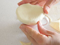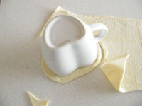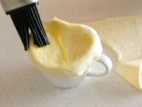 4.カップに準備したスープあるいはシチューを7分目ほど注ぎます。卵を溶き生地の周囲に塗ります。塗った方を下にして、カップの縁に被せる感じでピチっと蓋をします。