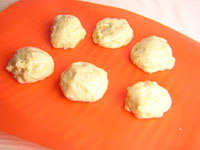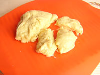 台の上に取り出し6等分します。バターがたっぷり入っている生地なので、キャンバス生地を使用せずに、シリコン製のベーキングシートの上で、作業をしてみました。(後片付けが簡単でした。)