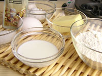 そこへ、柔らかくしたバター・卵を入れて、牛乳を加えながら、ミキシングします。初めは3秒づつ5回ミキシング。ここで蓋をはずしてスパチュラで、側面に飛び散った粉やバターをきれいにおとして、再び蓋をして一気に20秒ミキシングします