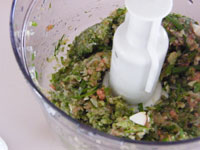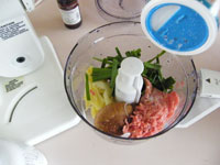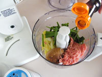 ●ボッシュ・コンパクトミキサーの別売りパーツ「マルチブレンダー」に、材料を入れたらダダー、ダダーと食材をチョップしましょう。これで餃子の具の出来上がり!今回は餃子の皮2枚でひとつの「まん丸餃子」を作ります。