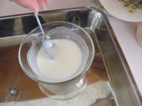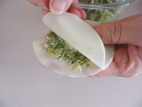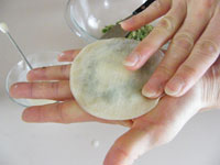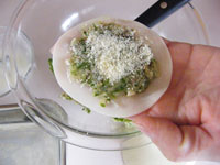 3.餃子の皮に具を置き薄く平らにのばします。ぺったんこが良いです。具の上にパルメザンチーズをふります。周囲に水溶き小麦粉をつけます。もう一枚の皮をのせます。まわりをピチっと閉じましょう。これで準備完了!