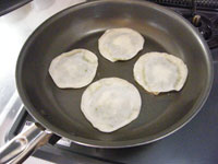 4.フライパンを火にかけ熱します。油をまわし入れ、まん丸餃子を並べます。大きなフライパンなら4個は並びます。