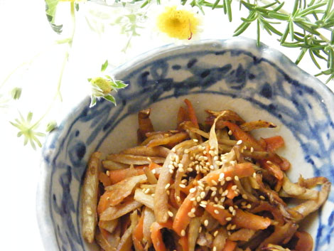 5.水分がなくなるまで炒めます。途中でゴボウと人参の火の通り具合をみてください。まだ固いのに水分がなくなってしまった場合は、水を大匙1加えさらに炒めましょう。出来上がったら小鉢の取ります。