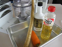 1.ボッシュ・コンパクトミキサーの別売り「マルチブレンダー」にシュレッドディスクを装着して、ゴボウをセットします。高速の「4」で一気にカットしましょう。続けて人参もカットします。