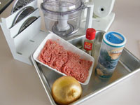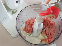 ●ボッシュ・コンパクトミキサーの別売りパーツ「マルチブレンダー」はフードプロセッサー機能を装備しておりますので、なんと!肉団子までこなしてくれます。つまりフードプロセッサー機能を別売りパーツの「マルチブレンダー」が持っているのです。さっそくダダーっと肉団子の種を作ってみました。たまねぎのみじん切りと肉の混ぜ合わせを一気にワークボウルの中でやってみましょう。