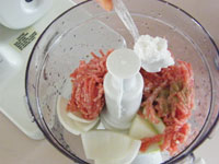 2.ダダーっと高速の「4」で一気にチョップ&混ぜ合わせをしましょう。材料が均等に回転しないこともあります。そんなときはスピードをかえることで上手に混ざることもあります。あるいはいったんワークボウルをはずしスパチュラなどで側面に張り付いてしまった材料を落とし、もう一度チョップしましょう。
