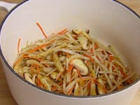 お鍋にサラダ油大2を入れ、ゴボウ・にんじんを1分炒め、次に油あげ・しいたけを加え、さらに1分炒めます。