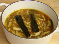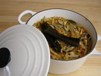 煮出し汁と調味料を加え、昆布をのせたらふたをして、いざオーブンへ