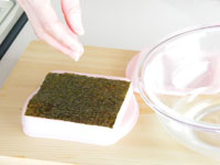 1.材料の海苔を容器に置きます。そのとき海苔のサイズが少しだけ大きいことが分かります。海苔は水分を含むとかなり縮んでしまいますので、ちょっとはみ出してしまったからと言ってカットしないでください。(小さくカットすると後で必ず後悔します!)決して容器のサイズに合わせてカットしないでください。海苔はあくまでも4分の1にカットした状態のものを使います。そして軽く指先に水をつけ(寿司飯の場合は水で薄めた酢)海苔表面にパッ、パッ、と水滴を付けます。こうしておくと容器に海苔をセットし易いです。