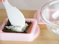 3.蓋の方をピチとセットしギューと押します。ひっくり返し、蓋の方にのせる感じで取り出します。この要領で作りたい数だけ「海苔&ご飯」を作ります。